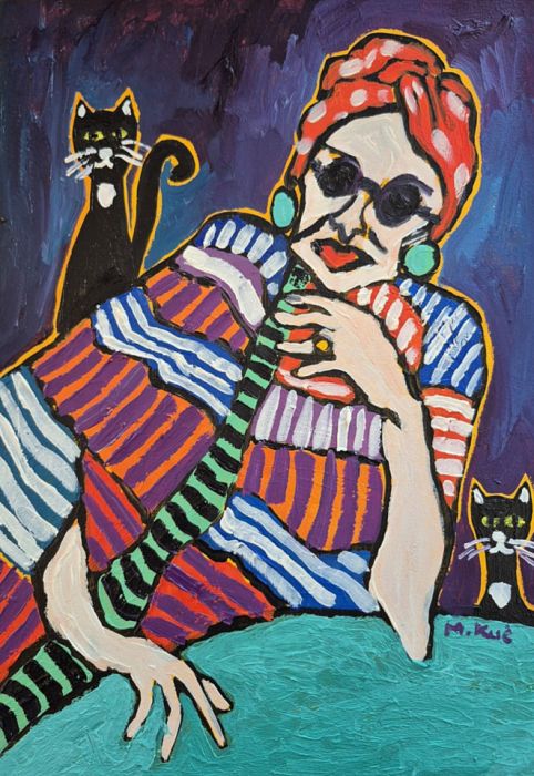 Towarzyszą jej dwa czarne koty — niemal strażnicy ciszy. Jeden stoi za jej plecami, drugi z boku, obaj o zielonkawych, czujnych oczach. Są stylizowani, symboliczni, z białymi plamkami na piersi, jak znaki rozpoznawcze. Wnoszą do obrazu nutę tajemnicy, niezależności i lekkiego humoru