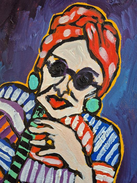 Centralną postacią jest kobieta o spokojnej, zamyślonej twarzy. Jej rysy są uproszczone, niemal maskowe — oczy ciemne, głębokie, zamknięte w sobie, usta czerwone, lekko wygięte w półuśmiechu. Głowę okala czerwona chusta w białe kropki, która nadaje jej charakteru i przywodzi na myśl ludową opowieść lub domowe ciepło. Duże, turkusowe kolczyki kontrastują z resztą kompozycji, przyciągając wzrok jak drobne akcenty światła.