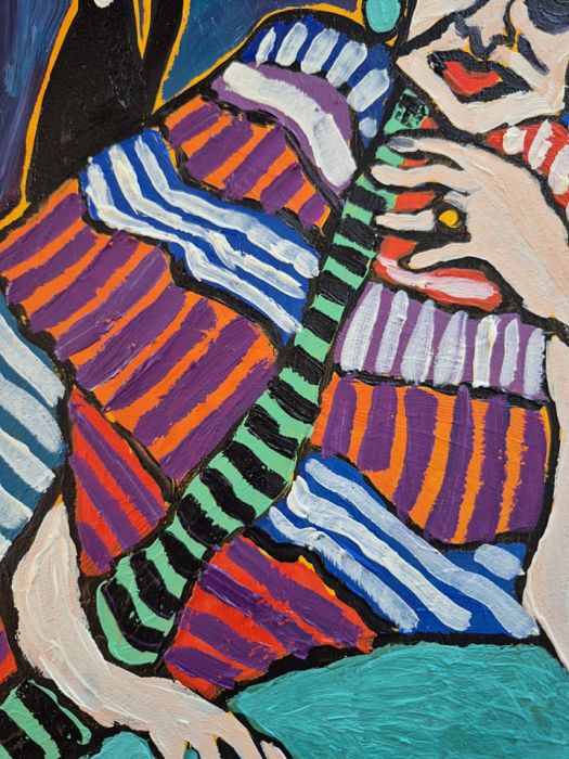 Postać ubrana jest w barwną, pasiastą suknię — rytmiczne pasy czerwieni, fioletu, błękitu, zieleni i bieli pulsują na płótnie, tworząc wrażenie ruchu i miękkości. Faktura farby jest wyraźna, gest pędzla odważny i szczery, co nadaje całości surową autentyczność. Kobieta opiera się o turkusową powierzchnię, jej dłoń wydaje się ciężka od myśli, jakby podtrzymywała nie tylko ciało, ale i nastrój chwili.