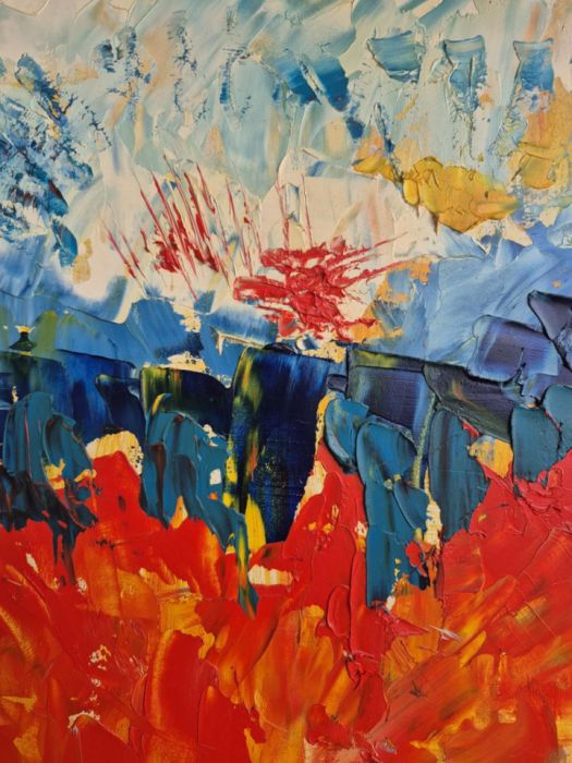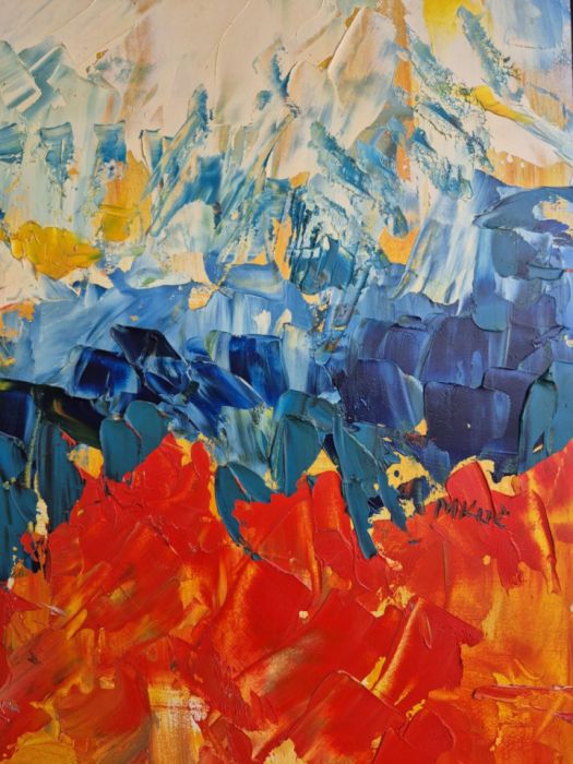 Niżej wszystko się zmienia. Błękity zagęszczają się, ciemnieją, zaczynają drżeć. A potem nagle – eksplozja. Czerwień i pomarańcz rozlewają się jak ogień, jak lawa, jak emocje, które przestały się mieścić w granicach. Farba wygląda, jakby została rzucona z impetem – dziko, bez kontroli, ale jednocześnie z jakąś wewnętrzną logiką.