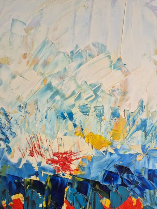 U góry – chłód i cisza. Warstwy bieli i lodowatego błękitu przypominają poszarpane lodowce albo niebo, które jeszcze nie zdecydowało, czy chce być spokojne, czy groźne. Pociągnięcia są grube, niemal rzeźbiarskie – jakby ktoś budował tę przestrzeń, a nie tylko ją malował.