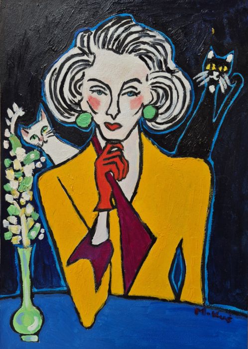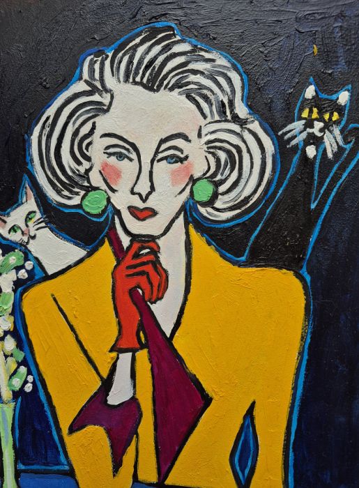 Na obrazie dominuje głęboka czerń tła, jakby noc była tu gęsta i lekko chropowata od farby. Pośrodku siedzi kobieta o twarzy zbudowanej z prostych linii, bieli i różowych rumieńców, z włosami w szerokich, falujących pasmach. Żółta marynarka świeci jak latarnia, a czerwone rękawiczki i usta robią mocny kontrast. Zielone kolczyki są okrągłe i trochę zuchwałe. Z lewej wąski wazon z białymi kwiatami, obok biały kot, z prawej czarny z żółtymi oczami. Jest trochę jak teatr. Artysta używa grubego konturu i płaskich plam koloru, w stylu lekko ekspresyjnym, z widoczną fakturą pociągnięć. Czuję spokój i napięcie naraz, taki mood do myślenia. Ona wygląda, jakby znała sekret i nie chciała go powiedzieć. Koty są śmieszne i trochę straszne. To pani i dwa kotki.