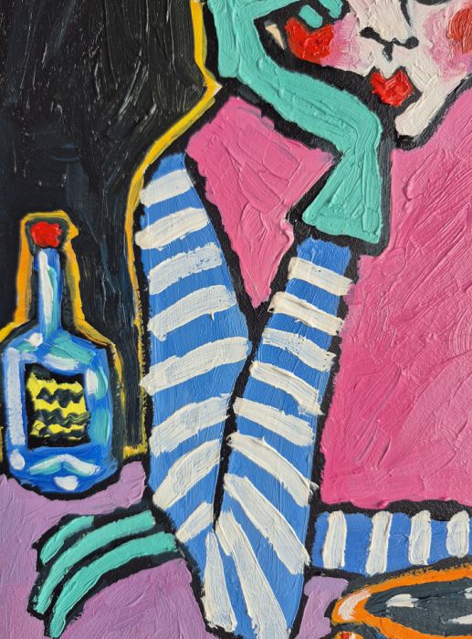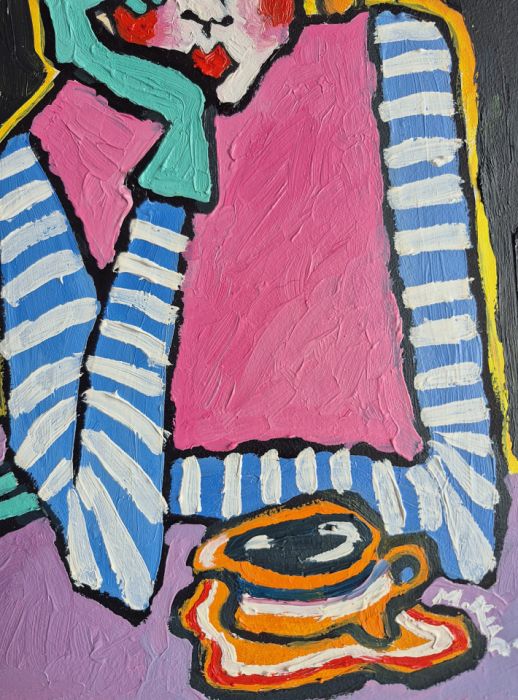 Obraz pulsuje intensywnością barw i emocji, balansując na granicy naiwności i świadomej deformacji. Centralna postać — kobieta o przerysowanych rysach, ukryta za grubymi konturami i kontrastowymi plamami koloru — zdaje się zawieszona w stanie cichej zadumy. Jej twarz, niemal maskowata, z wyraźnie zaznaczonymi rumieńcami i zamyślonym spojrzeniem, niesie w sobie nutę melancholii, ale i subtelnej ironii.
