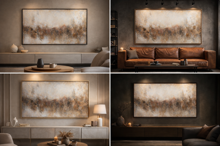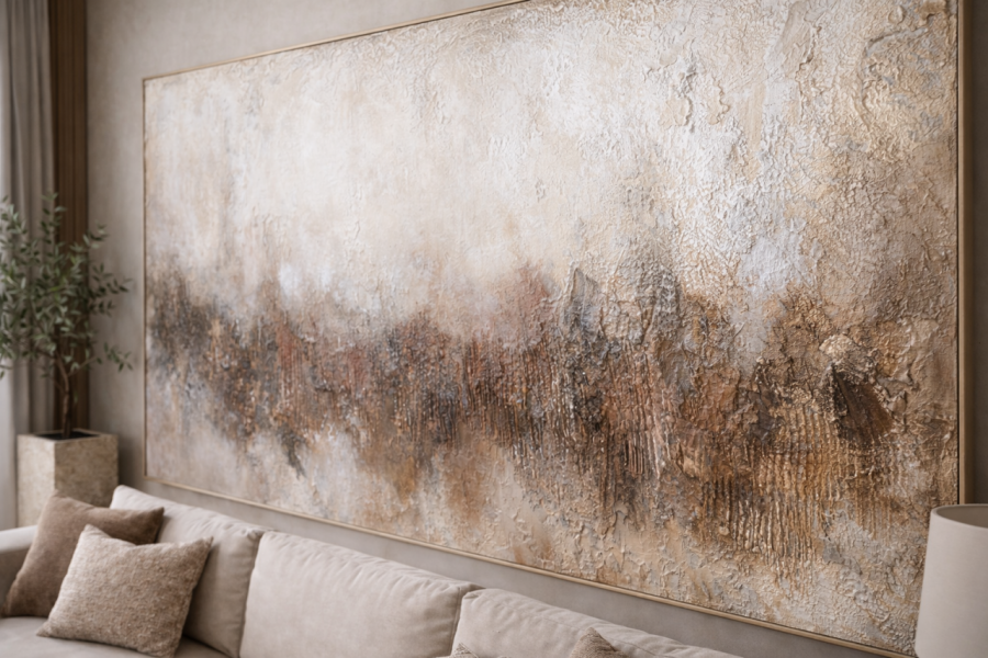 Dzięki wyraźnej fakturze obraz reaguje na światło, co nadaje mu wyjątkowej głębi i sprawia, że zmienia się w zależności od pory dnia i kąta patrzenia.