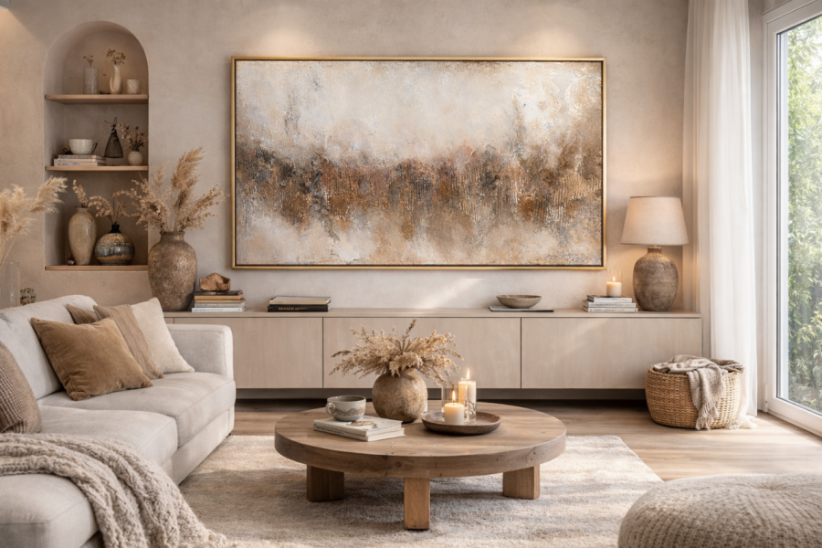 Kompozycja inspirowana linią horyzontu i naturalnymi strukturami ziemi tworzy spokojną, elegancką formę, która pięknie współgra ze współczesnymi wnętrzami. Subtelne przejścia beżu, bieli i ciepłych odcieni brązu wprowadzają harmonię i ponadczasowy klimat.