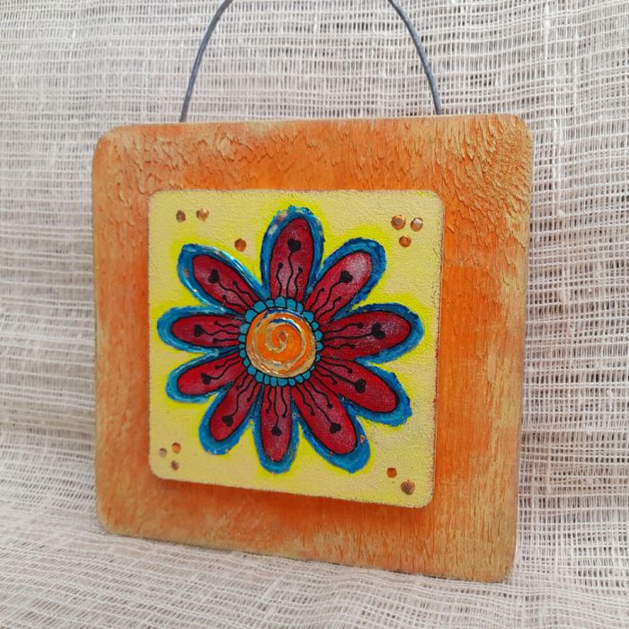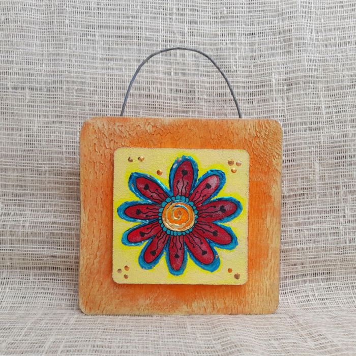 Na obrazku malowanym ręcznie na drewnianej desce, znajduje się motyw czerwonego kwiatka. Cieniowania nadają głębi i trójwymiarowości, sprawiając, że obrazek nabiera realistycznego wyglądu. Złocenia dodają blasku i elegancji, przyciągając wzrok i dodając elementu luksusu. Całość kompozycji jest harmonijna i subtelna, idealnie komponując się z pomarańczowym tłem deski. Uchwyt z ocynkowanego drutu jest praktycznym dodatkiem, umożliwiającym łatwe zawieszenie obrazka na ścianie lub innej powierzchni. Całość jest wykonana z dbałością o detale i precyzję, co sprawia, że obrazek jest nie tylko piękną dekoracją, ale także wyjątkowym elementem wnętrza.
