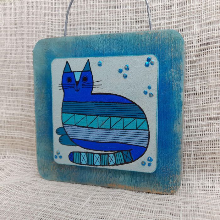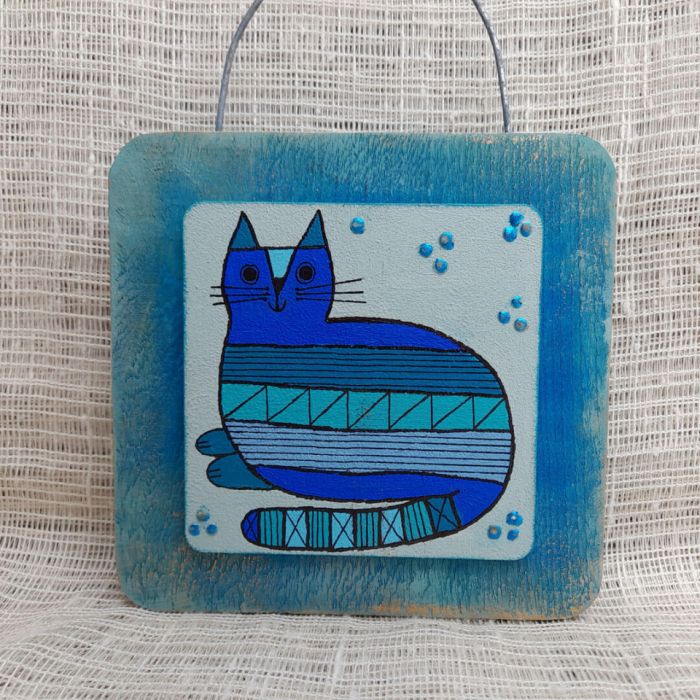 Obrazek przedstawia namalowanego ręcznie na drewnianej desce kota w paski. Został on wykonany za pomocą farb akrylowych. Pasiastego kotka ozdobiłam turkusowymi oraz srebrnymi błyszczącymi elementami, co nadaje mu jeszcze bardziej realistycznego wyglądu. Deska została pomalowana na intensywny niebieski kolor, który pięknie kontrastuje z kolorami kota. Wykonano na niej również delikatne złocenia. Całość została ozdobiona uchwytem z ocynkowanego drutu, dodając mu dodatkowego uroku i oryginalności. Obrazek ten doskonale wpasuje się w każde wnętrze, dodając mu subtelności i delikatności.