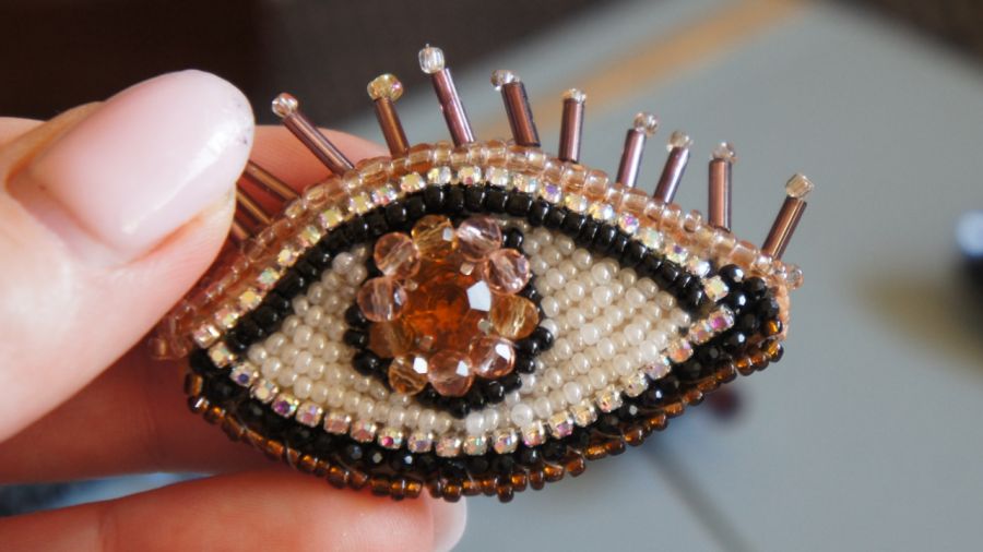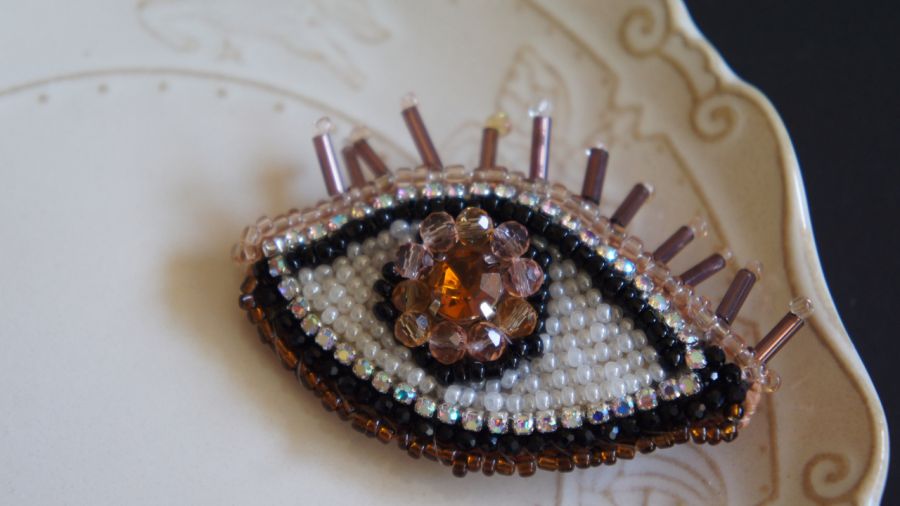 Ta broszka jest ozdobiona symbolem chroniącym przed złym okiem w kolorach ziemistego brązu i złota — pochodzących z naturalnych kolorów ziemi i lśniącego światła.