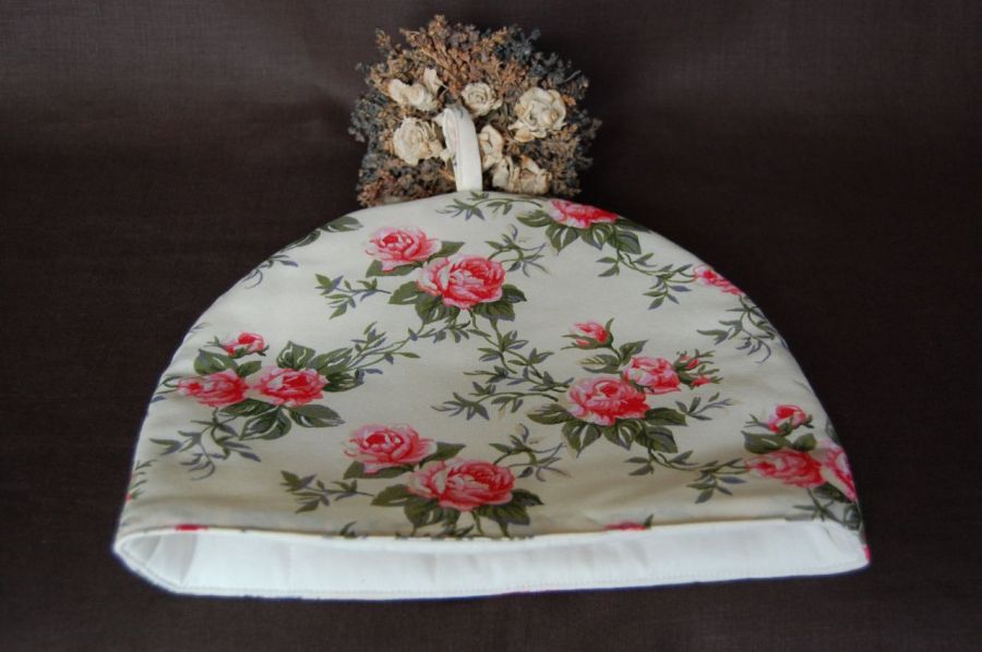 Ocieplacz/osłonka na czajnik "Angielskie róże" - wykonany z pięknej 100% bawełny z motywem róż. Spód/środek wykonany z bawełnianej podszewki, przepikowanej w kwadraty razem z ociepliną.