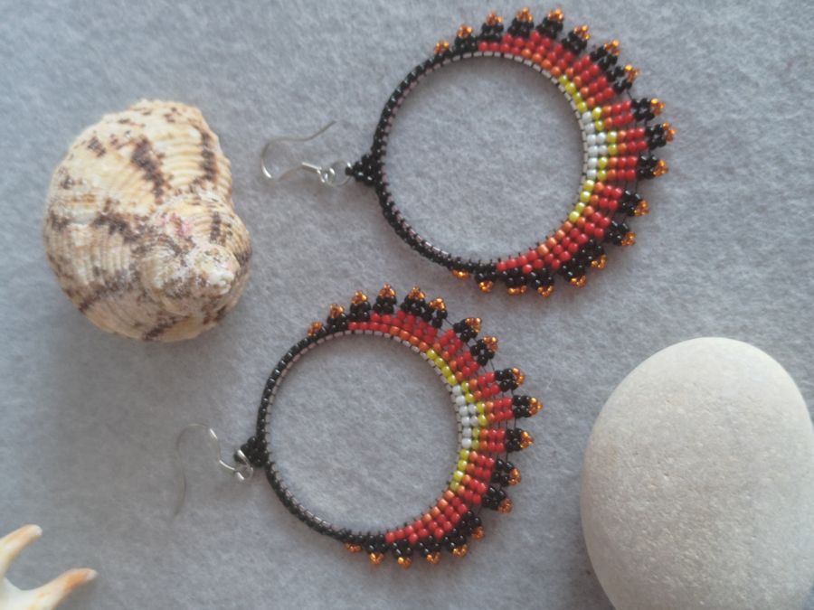 Kolczyki wykonane są z japońskich koralików toho techniką beadingu na okrągłej, metalowej bazie o średnicy 4 cm. Koraliki w ognistych kolorach: czerwony, pomarańczowy, żółty, biały i czarny. Kolczyki są stylowe i nietuzinkowe, pięknie błyszczą w słońcu, dla osób, które lubią zaskakiwać. Kolczyki zawieszone są na otwartych biglach ze stali chirurgicznej.