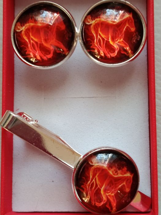 Nazwa produktu: Ogniste rumaki - spinki do mankietów i spinka do krawata
