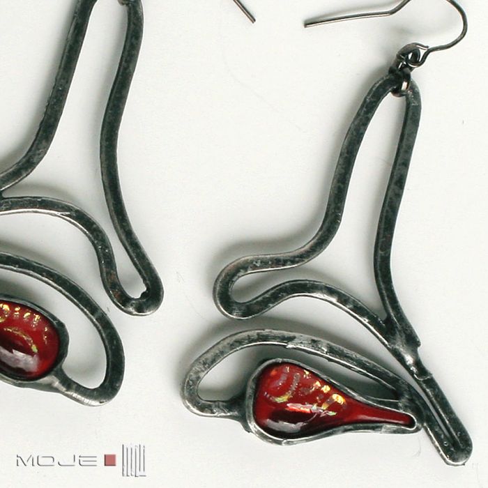 Wykonane są ze szklanych trójkątów wytopionych przeze mnie ze szkła czerwonego i dichroicznego metodą fusingu w temp. minimum 800 stopni oraz z młotkowanej miedzi - cynowanej, patynowanej i przecieranej. Metalowe bigle.