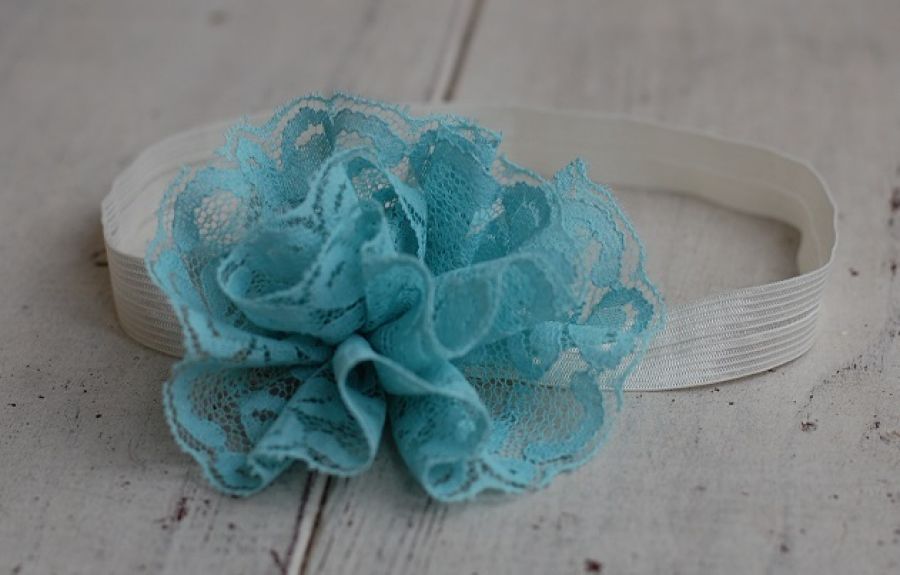 Opaska niemowlęca "Akwamaryna" - opaska do włosów ozdobiona ręcznie robionym, przestrzennym kwiatkiem z koronki w kolorze akwamaryny. Opaska wykonana na elastycznej, bardzo rozciągliwej gumeczce w kolorze złamanej bieli.