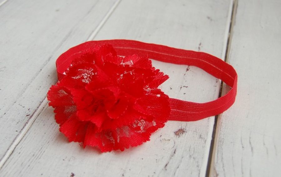 Opaska niemowlęca "Czerwień" - opaska do włosów ozdobiona ręcznie robionym, przestrzennym kwiatkiem z czerwonej koronki. Opaska wykonana na elastycznej, bardzo rozciągliwej gumeczce.