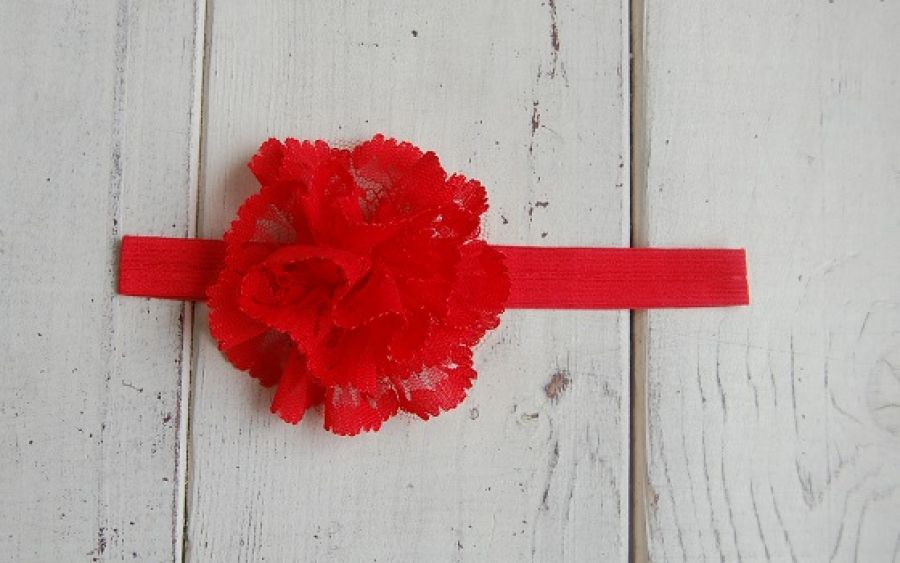 Opaska niemowlęca "Czerwień" - opaska do włosów ozdobiona ręcznie robionym, przestrzennym kwiatkiem z czerwonej koronki. Opaska wykonana na elastycznej, bardzo rozciągliwej gumeczce.