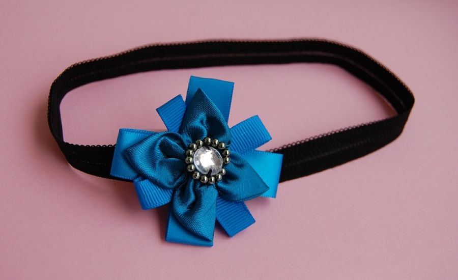 Opaska do włosów ozdobiona abstrakcyjnym, eleganckim kwiatem. Kwiat wykonany z satynowych i rypsowych tasiemek, satynowej tkaniny (płatki), na środku ozdobiony koralikami.