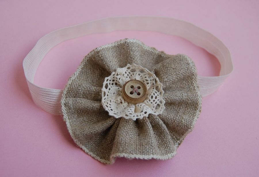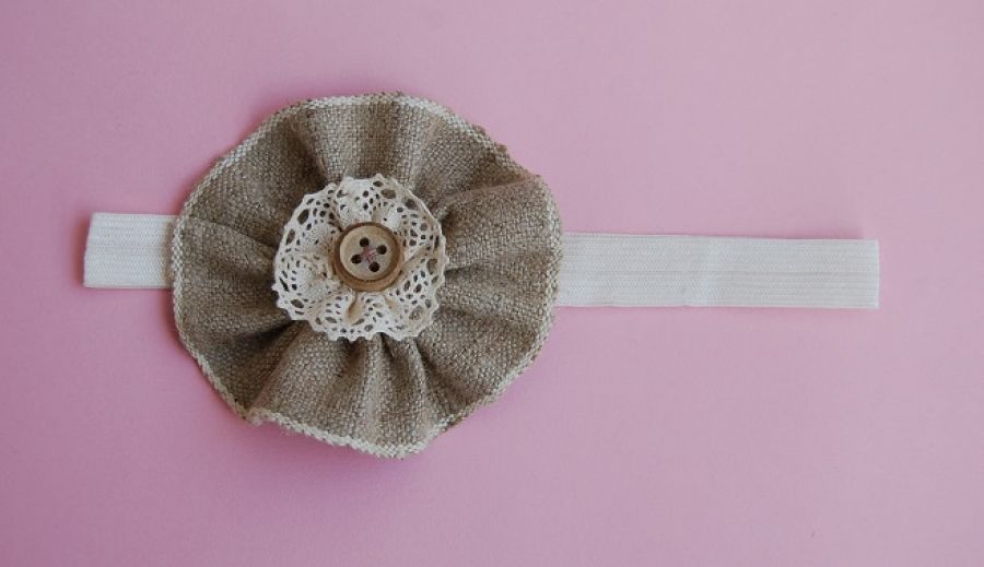 Opaska niemowlęca "Lniany kwiat" - opaska do włosów ozdobiona ręcznie robionym, lnianym kwiatkiem. Wewnątrz mniejszy kwiatuszek z koronki bawełnianej, na środku drewniany guziczek. Opaska wykonana na elastycznej, bardzo rozciągliwej gumeczce w kolorze złamanej bieli. Całość utrzymana w rustykalnej stylistyce.