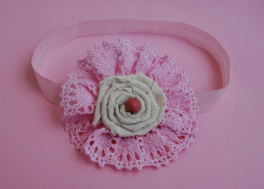 Opaska niemowlęca "Mała rusałka w różu" - opaska do włosów ozdobiona ręcznie robionym kwiatkiem z surówki bawełnianej, na środku drewniany koralik. Dookoła kwiatka bawełniana koronka w kolorze różowym. Opaska wykonana na elastycznej, bardzo rozciągliwej gumeczce w kolorze delikatnego różu. Całość utrzymana w rustykalnej stylistyce.