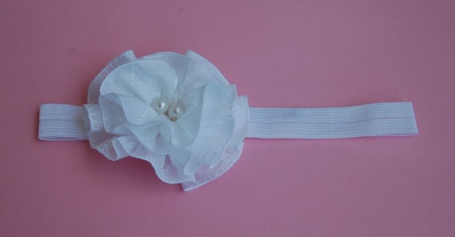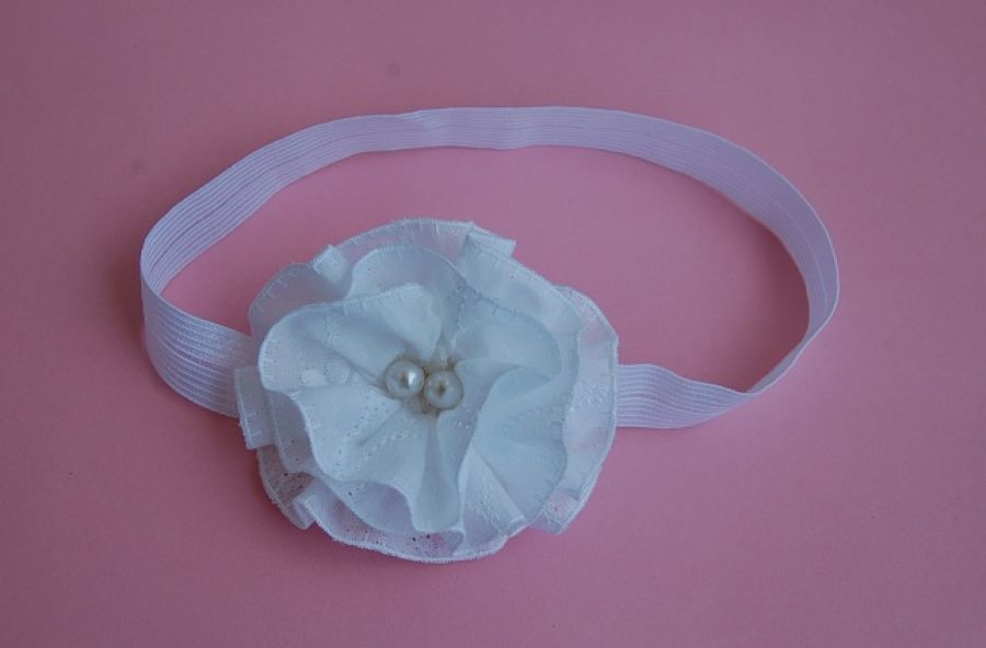 Opaska do włosów ozdobiona przestrzennym kwiatem z białej, bawełnianej, haftowanej taśmy. Na środku dwie białe perełki. Opaska wykonana na elastycznej, delikatnej, bardzo rozciągliwej gumce.