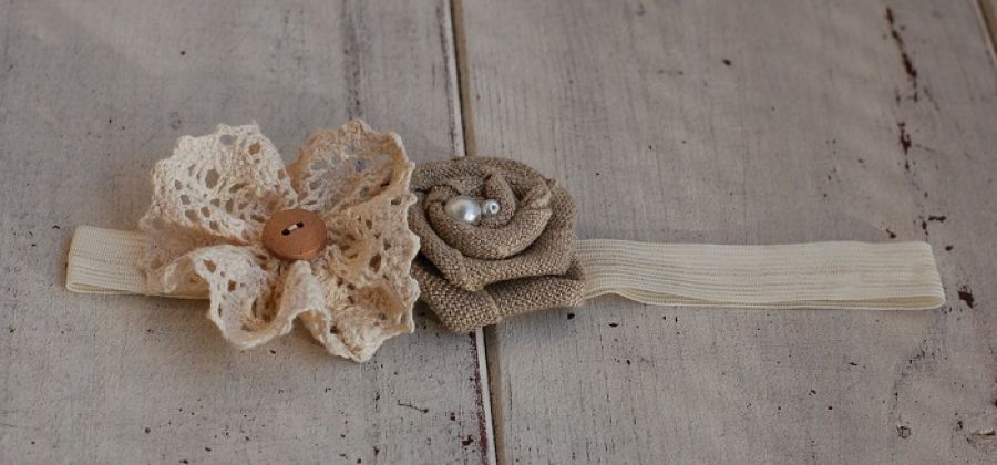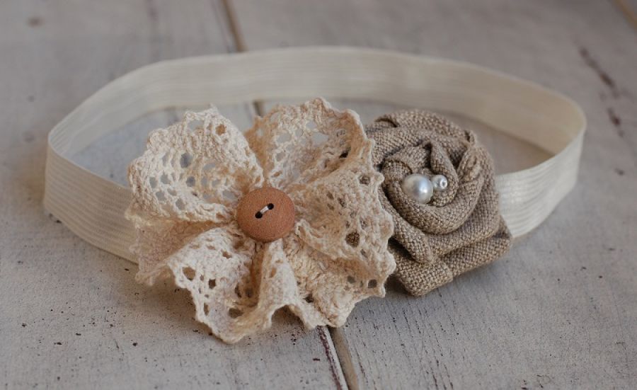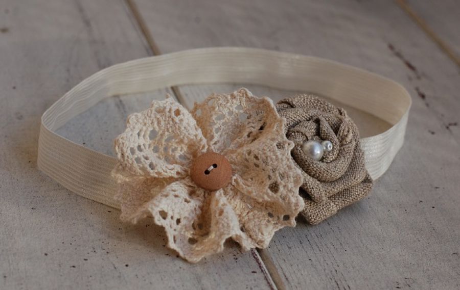 Opaska niemowlęca "Rustykalna" - opaska do włosów ozdobiona ręcznie robionymi kwiatkami: lnianym ozdobionym perełkami oraz kwiatkiem z koronki bawełnianej ozdobionym drewnianym guzikiem.. Opaska wykonana na elastycznej, bardzo rozciągliwej gumeczce w kolorze złamanej bieli. Całość utrzymana w rustykalnej stylistyce.