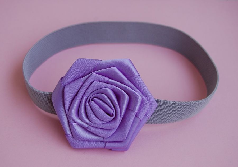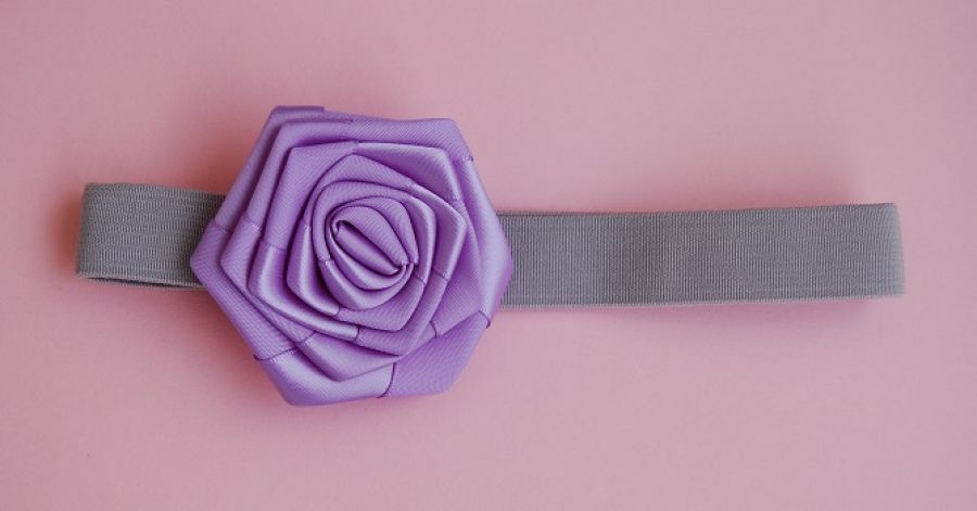 Opaska do włosów ozdobiona kwiatem z satynowej, fioletowej taśmy. Opaska wykonana na szarej, elastycznej i rozciągliwej gumce. Całość utrzymana w pastelowej tonacji