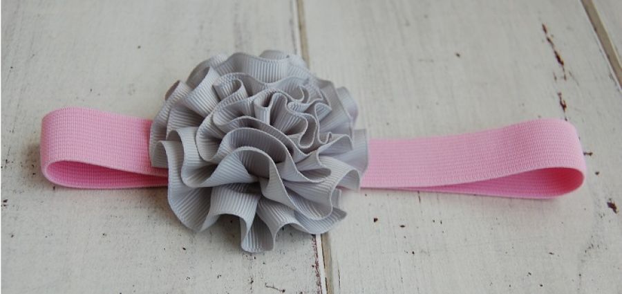 Opaska do włosów ozdobiona przestrzennym kwiatem z rypsowej, szarej taśmy. Opaska wykonana na elastycznej, rozciągliwej gumce w kolorze pastelowego różu.