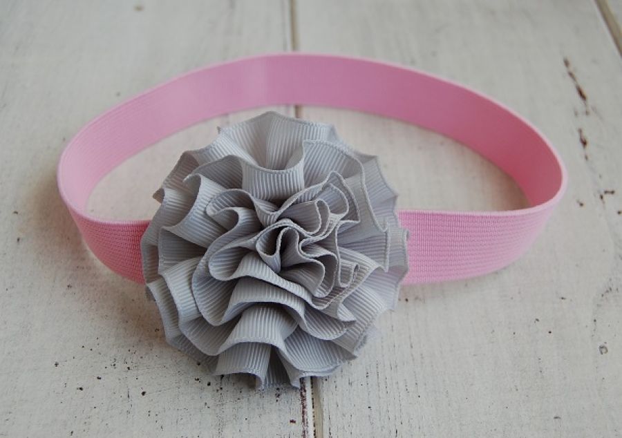 Opaska do włosów ozdobiona przestrzennym kwiatem z rypsowej, szarej taśmy. Opaska wykonana na elastycznej, rozciągliwej gumce w kolorze pastelowego różu.