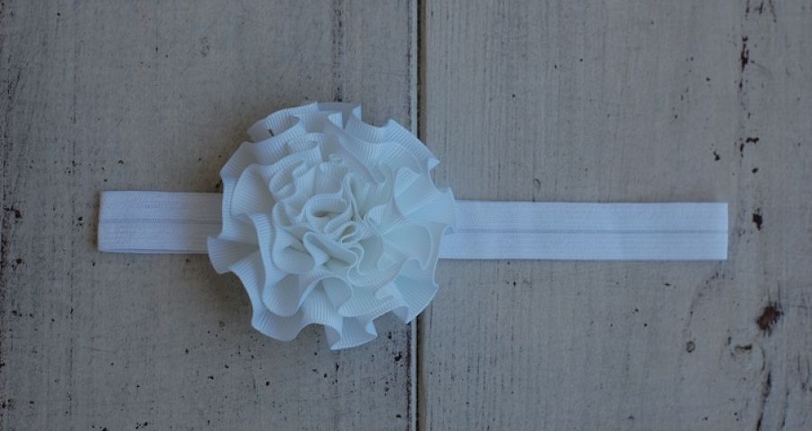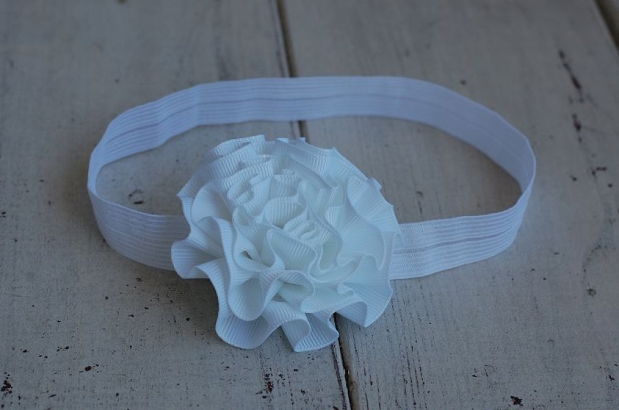 Opaska do włosów ozdobiona przestrzennym kwiatem z rypsowej, białej taśmy. Opaska wykonana na elastycznej, rozciągliwej białej gumce.
