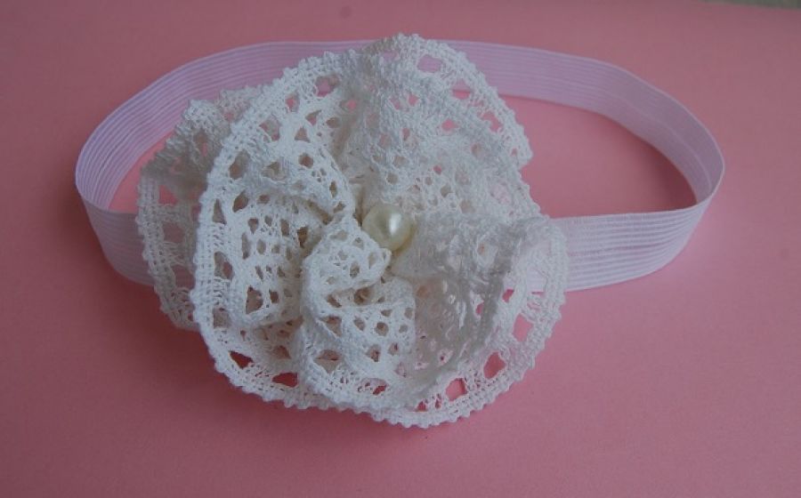 Opaska do włosów ozdobiona przestrzennym kwiatem z białej, bawełnianej koronki klockowej. Na środku biała perełka. Opaska wykonana na elastycznej, delikatnej, bardzo rozciągliwej gumce.