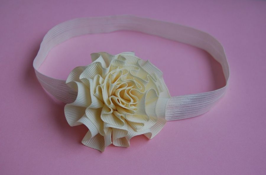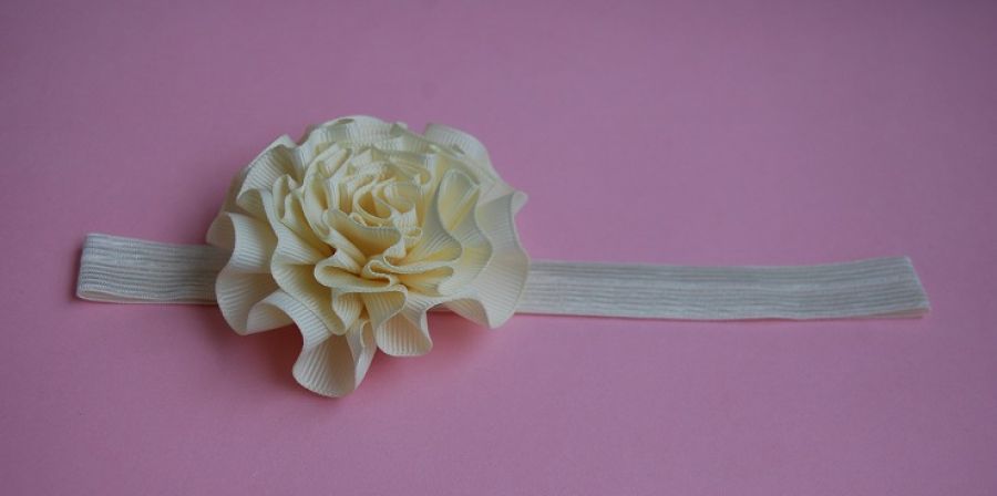 Opaska do włosów ozdobiona przestrzennym kwiatem z rypsowej taśmy w kolorze złamanej bieli/śmietankowym. Opaska wykonana na elastycznej, bardzo rozciągliwej gumce.