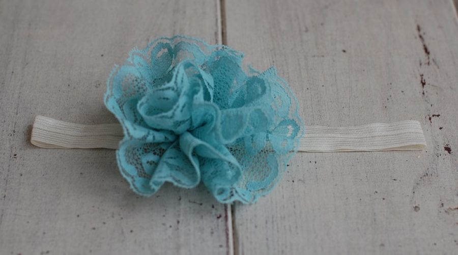Opaska niemowlęca "Akwamaryna" - opaska do włosów ozdobiona ręcznie robionym, przestrzennym kwiatkiem z koronki w kolorze akwamaryny. Opaska wykonana na elastycznej, bardzo rozciągliwej gumeczce w kolorze złamanej bieli.