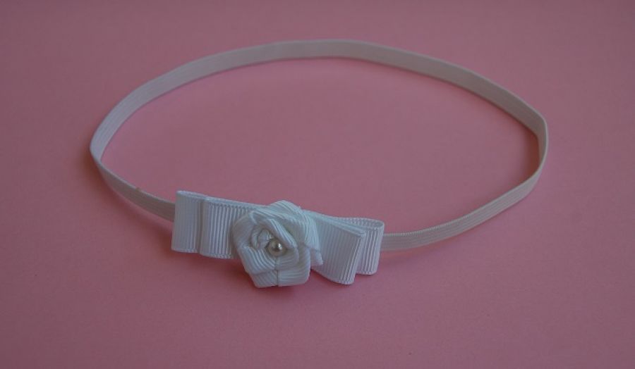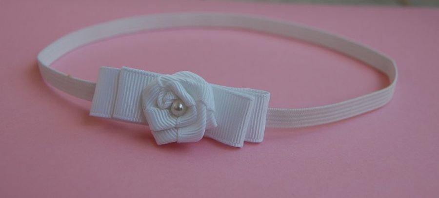 Opaska niemowlęca "Biała kokardka z różyczką" - opaska do włosów ozdobiona dwuwarstwową kokardką z rypsowej taśmy. Środek kokardki zdobi mała różyczka z perełką. Opaska wykonana na elastycznej, rozciągliwej gumeczce.