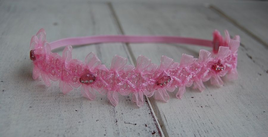 Opaska niemowlęca "Diadem w delikatnym różu" - opaska do włosów ozdobiona wstążeczkami z organzy, koralikami z dżecikami. Opaska wykonana w połączeniu z gumką w delikatnym, różowym kolorze.