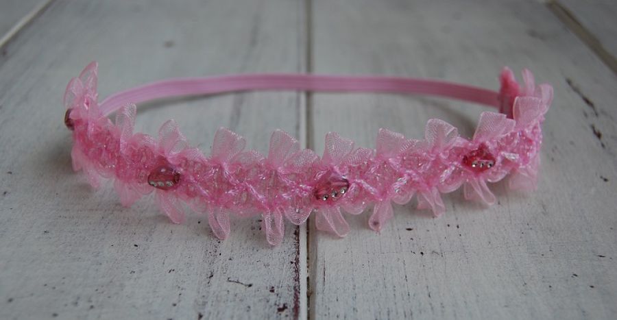 Opaska niemowlęca "Diadem w delikatnym różu" - opaska do włosów ozdobiona wstążeczkami z organzy, koralikami z dżecikami. Opaska wykonana w połączeniu z gumką w delikatnym, różowym kolorze.