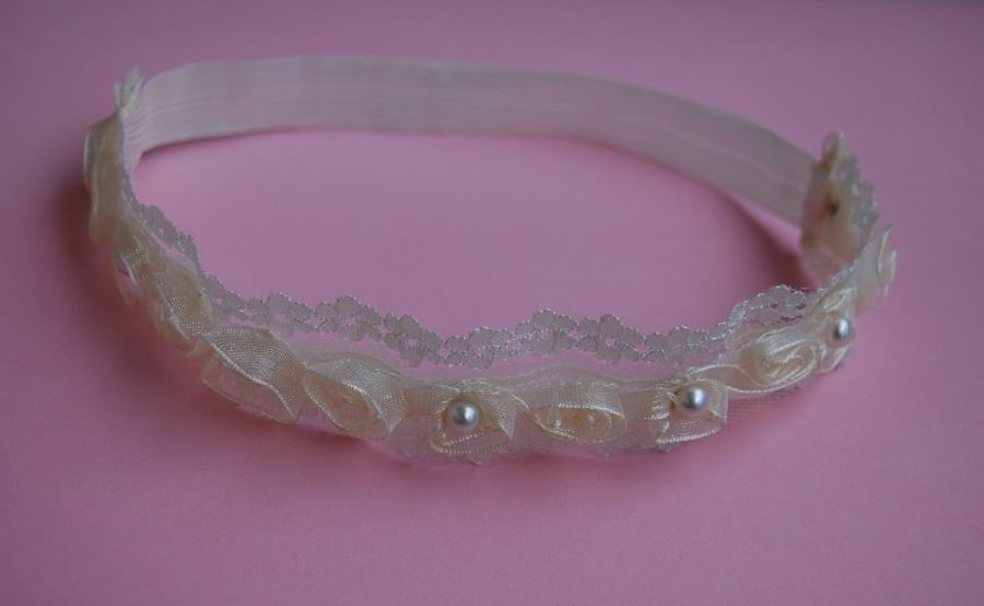 Opaska niemowlęca "Diadem w złamanej bieli" - opaska do włosów ozdobiona koronką, wstążeczkami z organzy, perełkami. Opaska wykonana w połączeniu z gumką w kolorze złamanej bieli.