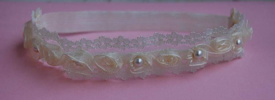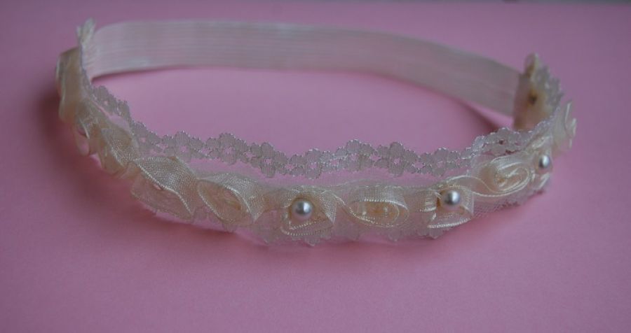 Opaska niemowlęca "Diadem w złamanej bieli" - opaska do włosów ozdobiona koronką, wstążeczkami z organzy, perełkami. Opaska wykonana w połączeniu z gumką w kolorze złamanej bieli.