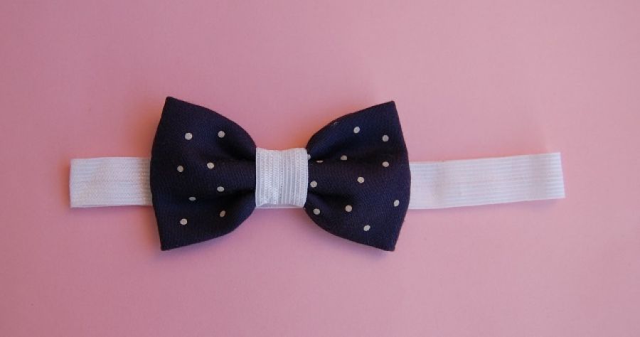 Opaska niemowlęca "Granatowa w kropeczki" - opaska do włosów ozdobiona kokardą z granatowej tkaniny w białe groszki. Opaska wykonana na elastycznej, bardzo rozciągliwej gumeczce w białym kolorze.