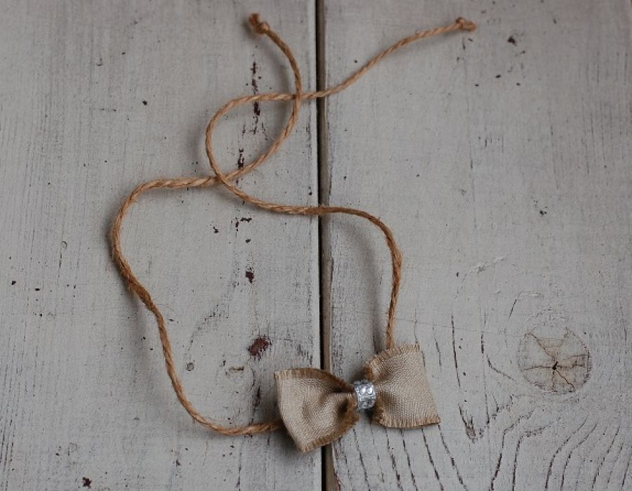 Opaska niemowlęca "Minimalistyczna kokardka" - opaska ozdobiona malutką kokardką z tkaniny, na środku przełamana taśmą z dżetami. Brzegi kokardki celowo postrzępione. Wykonana na sznurze jutowym. Jest to opaska wiązana.