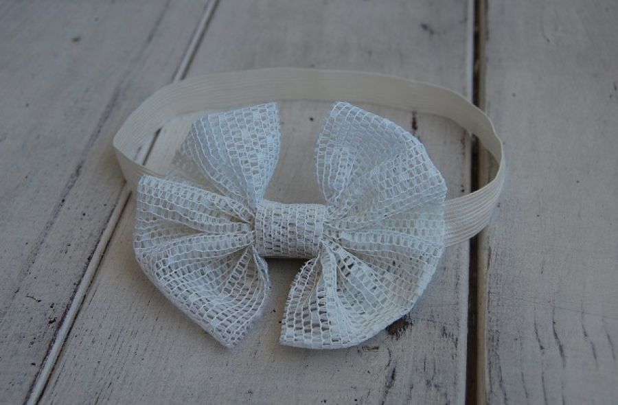 Opaska do włosów ozdobiona piękną, bogato marszczoną kokardą w stylu retro. Opaska wykonana na elastycznej, bardzo rozciągliwej gumeczce w kolorze ecri.