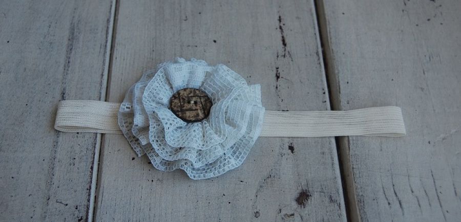 Opaska do włosów ozdobiona kwiatem wykonanym z kilku warstw siateczkowej tkaniny, na środku ozdobiony vintagowym guziczkiem. Opaska wykonana na elastycznej, bardzo rozciągliwej gumeczce w kolorze ecri.