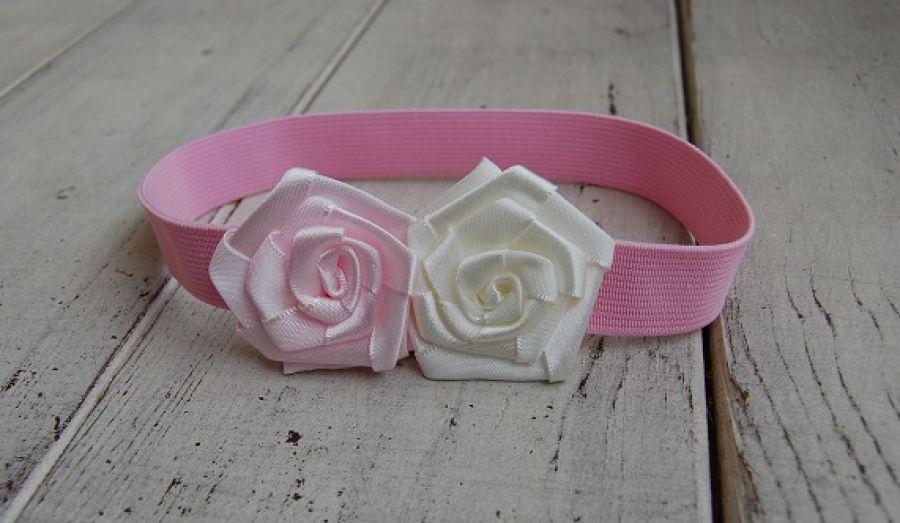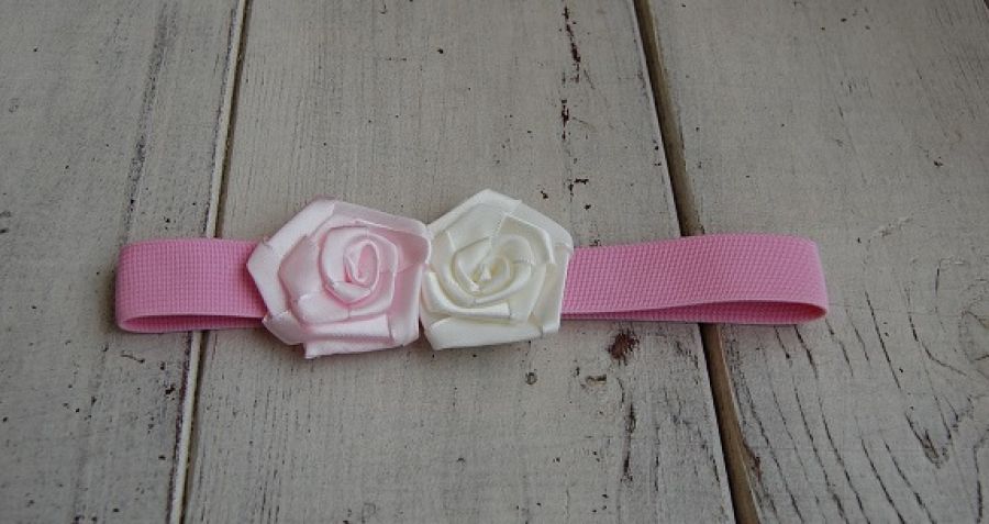 Opaska niemowlęca " Róż ze złamaną bielą" - opaska do włosów ozdobiona dwoma kwiatami z satynowej taśmy. Opaska wykonana na elastycznej, rozciągliwej gumce w pastelowym, różowym kolorze.