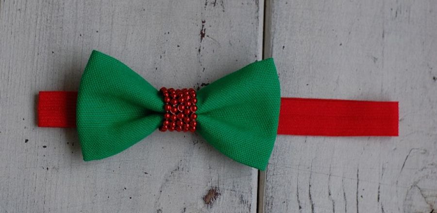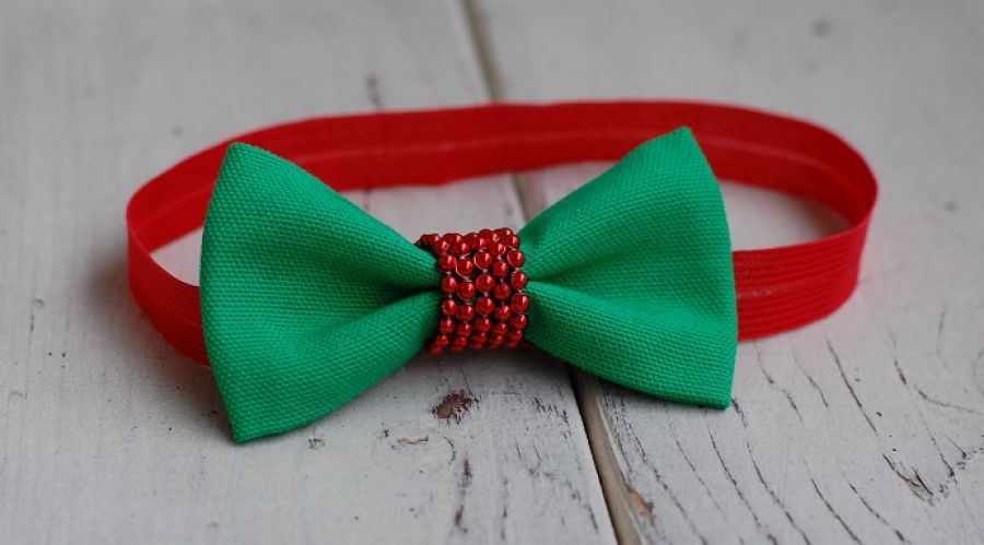 Opaska do włosów ozdobiona kokardą z zielonej bawełny, środek przełamany pięcioma rządkami czerwonych koralików. Opaska wykonana na czerwonej, bardzo elastycznej gumce. Całość utrzymana w kolorystyce Bożonarodzeniowej.