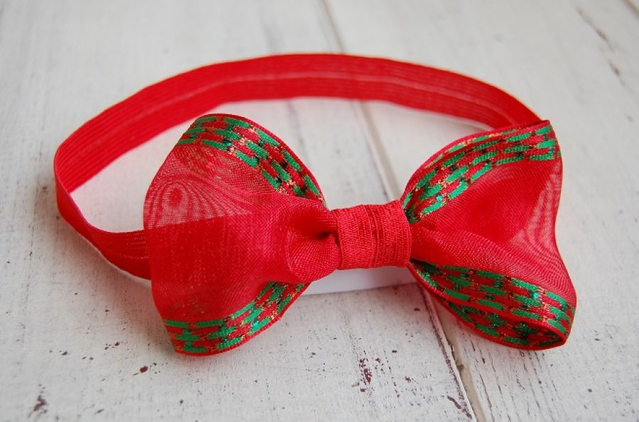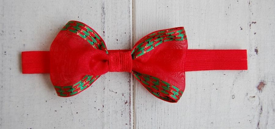 Opaska niemowlęca "Świąteczna kokarda" - opaska do włosów ozdobiona kokardą z czerwonej taśmy z organzy, wykończonej na brzegach świątecznym, zielono-czerwonym motywem. Opaska wykonana na elastycznej, bardzo rozciągliwej gumeczce w czerwonym kolorze.