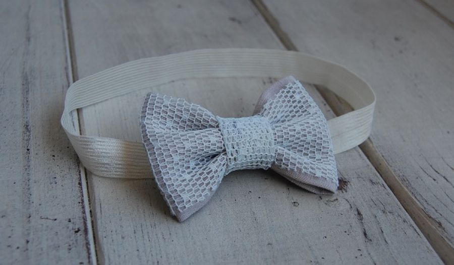 Opaska do włosów ozdobiona kokardą wykonaną z lnianej tkaniny w kolorze kawy z mlekiem, obleczona warstwą siateczkowej tkaniny. Opaska wykonana na elastycznej, bardzo rozciągliwej gumeczce w kolorze ecri.