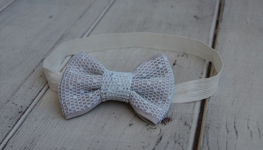 Opaska do włosów ozdobiona kokardą wykonaną z lnianej tkaniny w kolorze kawy z mlekiem, obleczona warstwą siateczkowej tkaniny. Opaska wykonana na elastycznej, bardzo rozciągliwej gumeczce w kolorze ecri.