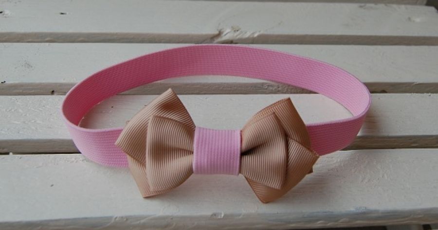 Opaska niemowlęca "Beż & róż" - opaska do włosów ozdobiona beżową, trzywarstwową kokardą z rypsowej taśmy. Opaska wykonana na elastycznej, rozciągliwej gumeczce w kolorze pastelowego różu.