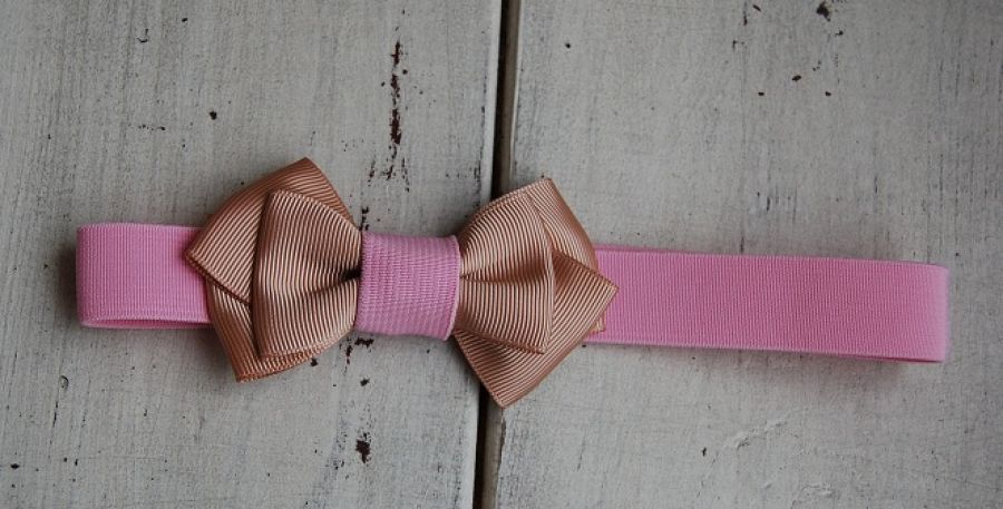 Opaska niemowlęca "Beż & róż" - opaska do włosów ozdobiona beżową, trzywarstwową kokardą z rypsowej taśmy. Opaska wykonana na elastycznej, rozciągliwej gumeczce w kolorze pastelowego różu.
