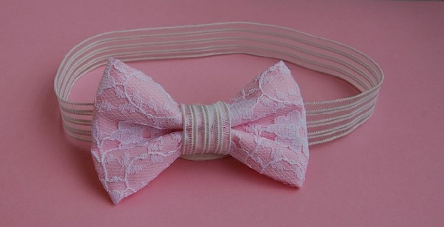 Opaska niemowlęca "Koronkowa kokardka" - opaska do włosów ozdobiona kokardą z białej, bieliźnianej koronki podbitej różową tkaniną. Opaska wykonana na elastycznej, bardzo rozciągliwej gumeczce.