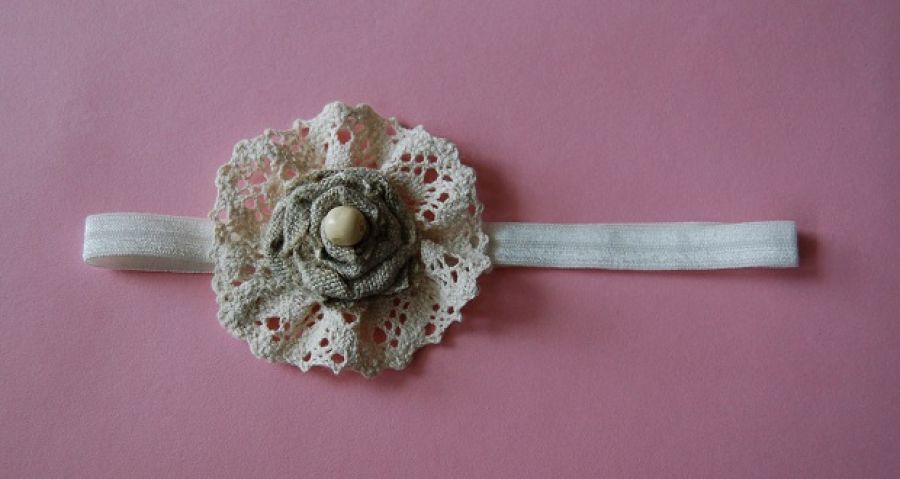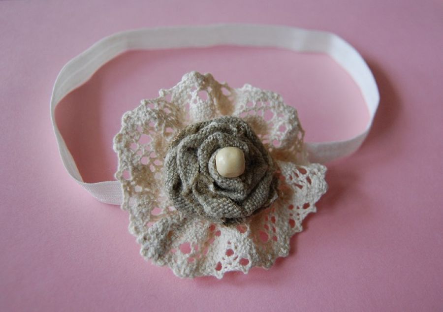Opaska niemowlęca "Mała rusałka" - opaska do włosów ozdobiona ręcznie robionym lnianym kwiatkiem z drewnianym koralikiem, dookoła otoczony bawełnianą koronką w kolorze ecri. Opaska wykonana na elastycznej, bardzo rozciągliwej gumeczce w kolorze złamanej bieli. Całość utrzymana w rustykalnej stylistyce.