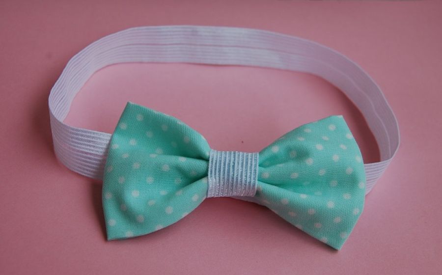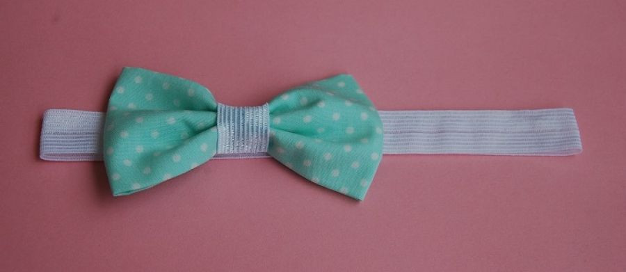 Opaska niemowlęca "PasteLOVE miętowe" - opaska do włosów, utrzymana w pastelowej tonacji, ozdobiona kokardą z miętowej tkaniny w białe groszki. Opaska wykonana na elastycznej, bardzo rozciągliwej gumeczce w białym kolorze.